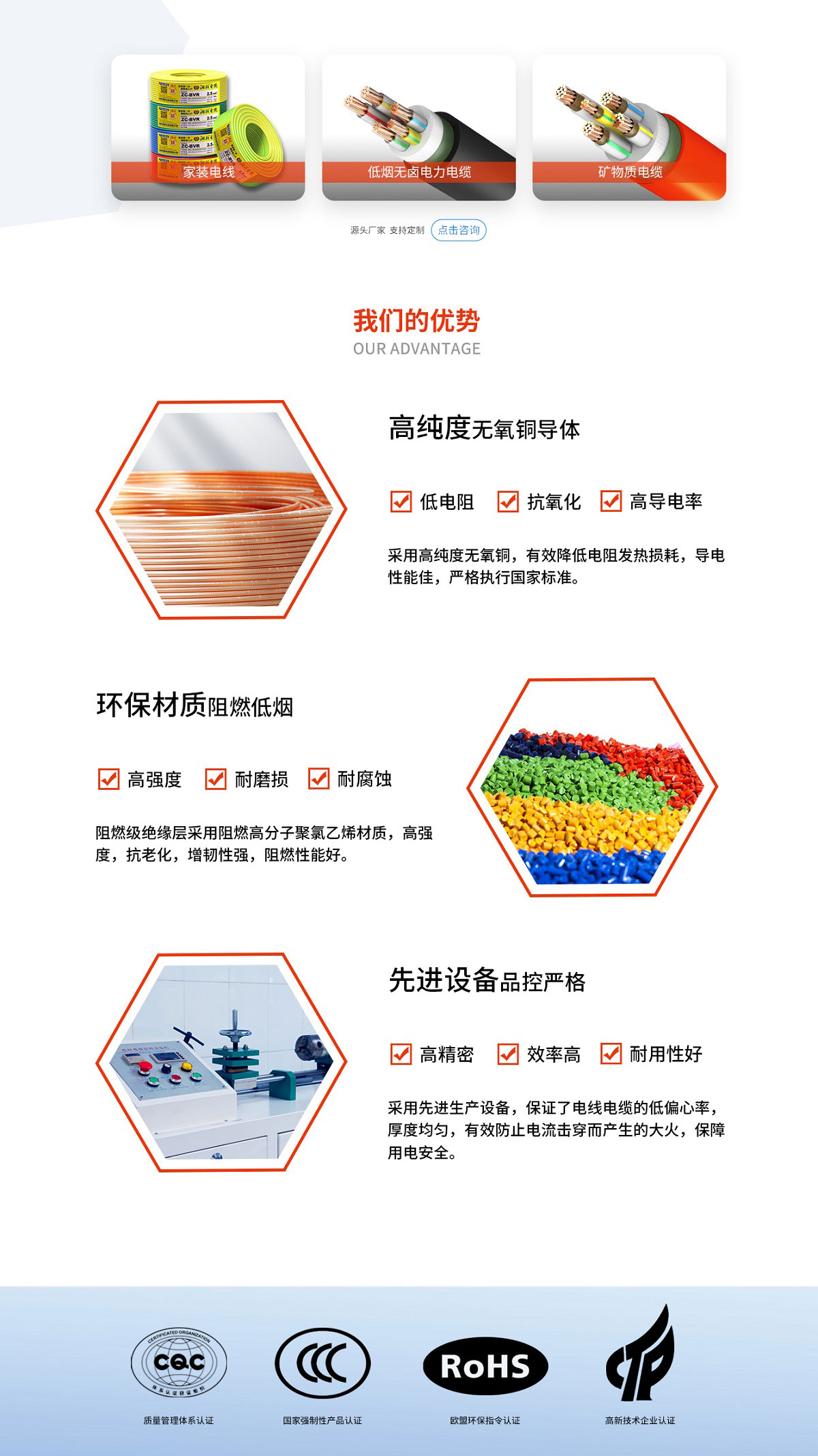 公司擁有國內一流的電線電纜生產和檢測設備,以科學的經營管理理念,引進高級專業技術及管理人才,組建實力雄厚的技術研發和企業管理團隊,建立高標準質量管理體系,對生產全過程實現智能化數字化管理。公司是國家高新技術企業、國家級專精特新“小巨人”企業、CNAS國家重點實驗室、湖南省企業技術中心、長沙市技術中心、湖南省新材料企業、湖南省綠色制造體系示范單位(綠色工廠)、湖南省制造業品牌培育試點企業、湖南省產融合作制造業重點企業、湖南省守合同重信用企業、長沙市專精特新小巨人企業、長沙市技術創新中心(產業引導類)、湖南省制造業品牌培育示范企業、瀏陽市誠信企業,先后通過國家強制性產品認證(CCC認證),全國工業生產許可證,歐盟CE認證、質量管理體系認證(ISO9001)、中國職業健康安全管理體系認證(ISO45001)、環境管理體系認證(ISO14001)、知識產權管理體系認證、武器裝備質量管理體系認證、IATF16949:2016質量管理體系認證、歐盟環保體系認證、礦用產品安全認證、能源管理體系認證,并榮獲CCTV《品牌中國》重點推薦品牌、品牌強國國貨之光、中國電纜行業十大品牌、工程建設推薦產品、質量檢驗國家標準合格產品、綠色環保產品、湖南省知名品牌、AAA企業等系列榮譽,得到業界的廣泛認可與贊譽。